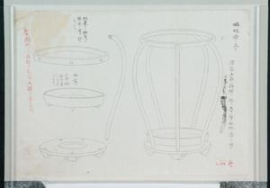 | 内容 | 七号 蝙蝠傘立テ 漆器上品ハ蒔絵ヲ施ス 又下等ハ木地ノ儘ニテ用ユ 組建テノ趣考ハ輸送ノ便ヲ計リシモノナリ 水受ケ 上品ハ銅器下等ハブリッキニテモヨシ 製図掛リノ品評ヲ乞ハズ 又譲リ与モセズ |