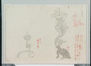| 内容 | 第拾貮号 甲 支那古図ニアルハ三足ニテ口ヨリ吹出シタルハ水気ニテ火焔ニアラス 此図火焔ノ先ニ蓮葉ノ如キモノヲ載セタルハ不都合ナリ 上図ノ如ク原本ニ基クヲ好トス 乙 難ナシト雖モ新趣ナシ |