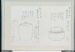 | 内容 | 第弐号 甲: 銅器水指 共蓋 塗蓋モ用ユ 高サ三寸五分斗 胴径五寸余 口径四寸斗 ウケクチ彫ハ圖ニ不限 高臺高サ三分 耳形ニ可取事 無難ナリ 第弐号 乙: 磁器水指 共蓋染付龍虎梅竹ノ画ナド可能 土焼ナレハ花ワケ薬ナド可能 手描キ墨画ナト置モヨシ 高サ五寸斗 胴茎四寸斗 口茎三寸5部キツキ口 蓋ツマミ焼ニヨッテ好アルベシ圖ニ不限 同 紐再考 倭古部ノ紐□ニ可改良 十八年八月十一日 原呉山 |