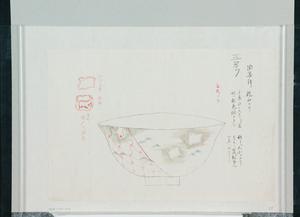 | 内容 | 三号 陶器鉢 乾山フウ 千鳥白クスリニテ置 地ノ配色調カタシ 平凡ナリ 形亦大小ニヨリモヨウノ置方数多シ 此表ハ凡ナリ 向付正面側面 もやう須磨乃関屋 |