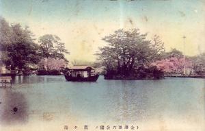 | 内容 | 明治期 池の南側から 明治42年屋形船(蓬莱丸)運行 中央右側に蓬莱島 左端は内橋亭 |