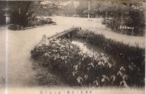 | 内容 | 大正期 眺望台側から 橋詰左に月見灯籠 右後方に唐崎松と霞ケ池 橋に手すりなし |