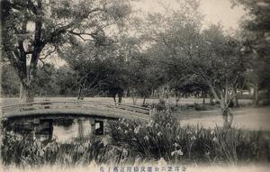 | 内容 | 明治期(明治39年以前) 勅使橋上流から 右が根上松側 曲水両岸にはカキツバタの花 |