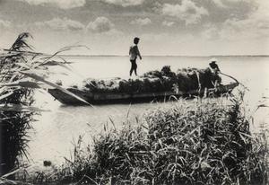 小舟を漕いでいる。舟に藁のようなものが積まれている。