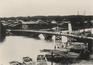 | 内容 | 川と橋の写真。木材を運ぶ舟が見える |