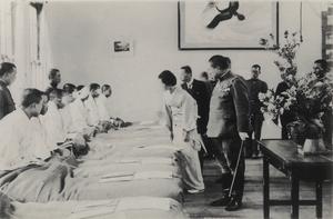 | 内容 | 病床が並ぶ大きな部屋に慰問軍人と夫人の姿。裏面に西本願寺裏方の書き込みあり |