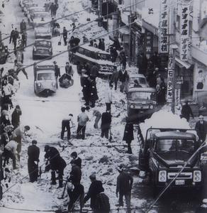 | 内容 | 雪で車が立ち往生しており、複数人が雪かきをしている。 |